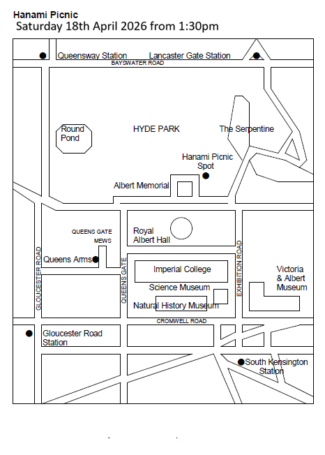 We will be holding our annual Hanami cherry blossom viewing party in Kensington Gardens, under the cherry trees close to the Albert Memorial, from around 1:30pm to 6:30pm on Saturday 18th April. Everyone is encouraged to bring along as much food and drink as you care to share or enjoy! (It is a fair walk to any decent shops or off licenses.)